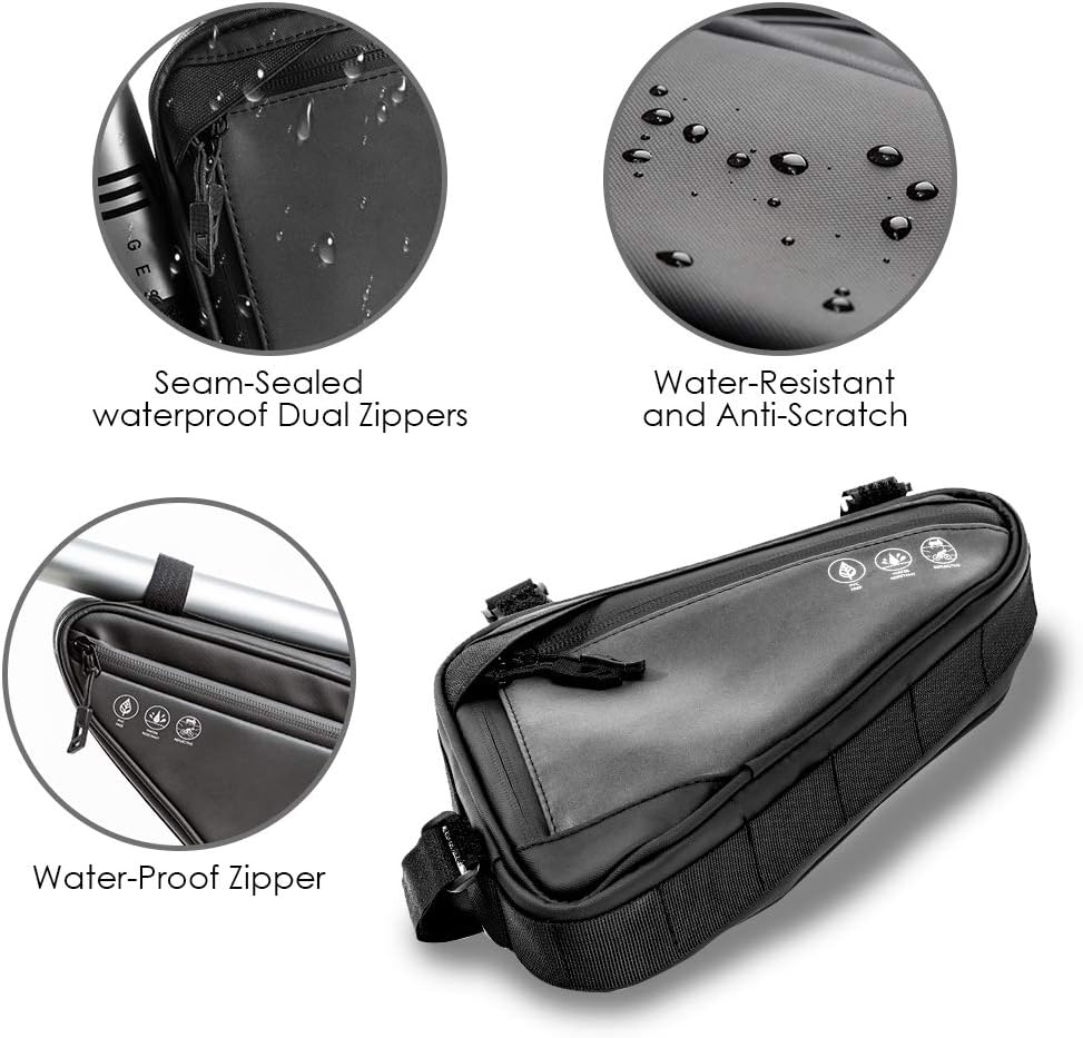 - Large Capacity & Big Opening — The cycling bike tube bag size is 8.86*6.1*2.17 Inch, has a large compartment on both sides, easy to hold your daily essentials and cycling items such as mobile phone, power bank, gloves, sunglasses, flashlight, mini bike pump, bike repair tools and other accessories. Which is an ideal solution to solve the troubles of carrying small bicycle gears during long-time cycle, perfect for outdoor riding. The bike front bag adopted large zippered opening mouth design fo